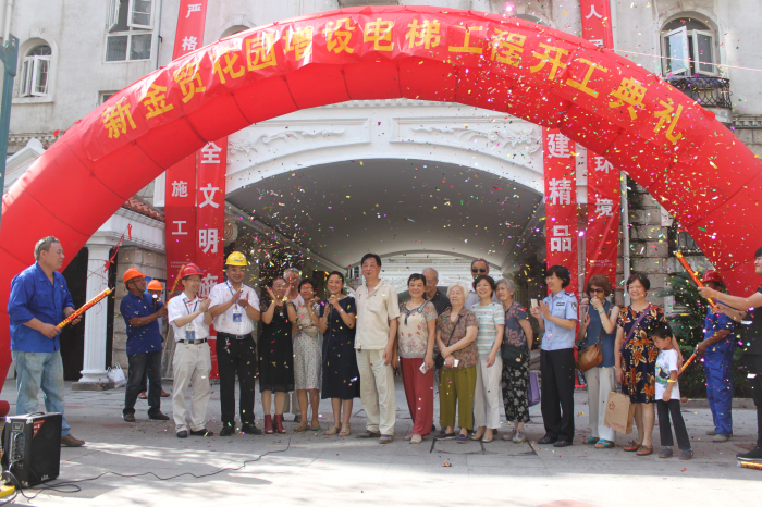 2017年8月24日上午8:00时分,南京市区风和日丽,位于南京市鼓楼区的新金贸花园小区主道路两旁一派喜庆热闹的景象:一个大大的拱形大红气球门上写着“新金贸花园增设电梯工程开工典礼”几个醒目的大字。4条长长的横幅分别从7楼顶处及2楼处高挂而下,横幅上“创建精品工程,安全文明施工”这些白色的大字同样引人注目。
