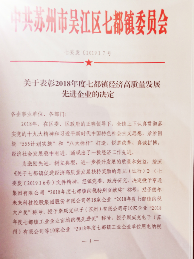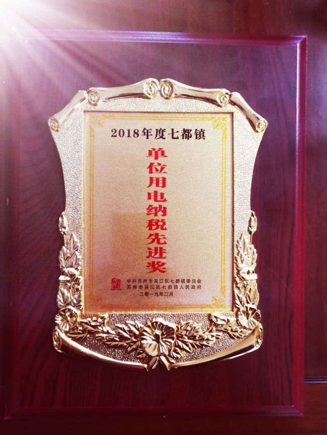 2019年2月14日,猪年初十,情人节。下午2:00时分,公司潘伟荣总经理从开会现场传来喜讯:华亿网页版荣获“2018年度吴江七都镇单位用电纳税先进奖” (见下列获奖名单及奖牌) 及“2018度年吴江七都镇单位纳税百强企业”的殊荣。这种荣誉,华亿网页版公司连续保持了4年。